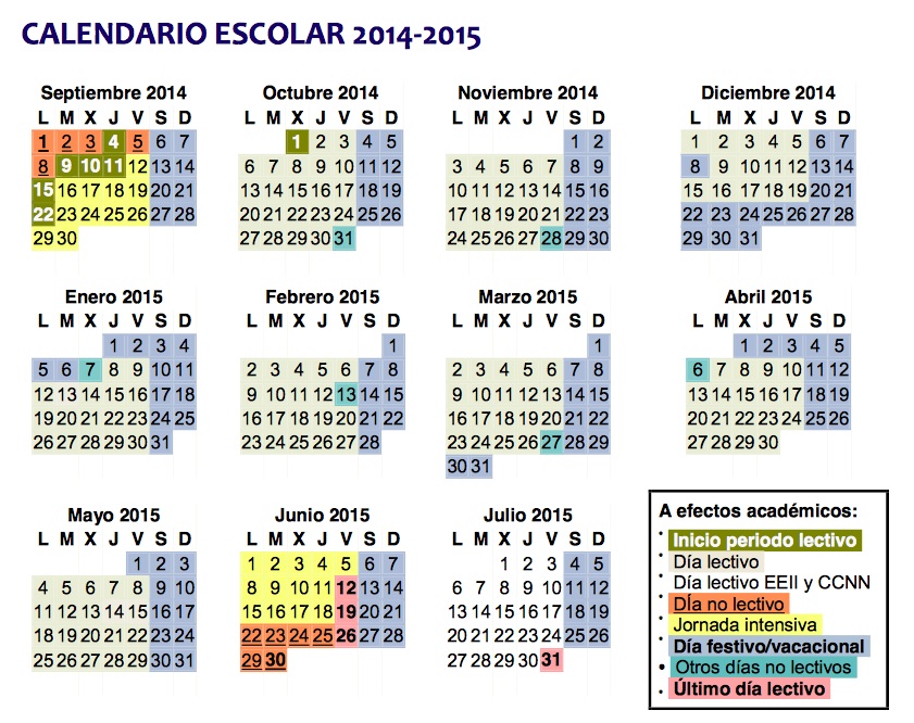 A estos días habrá que añadir los días propios de cada Comunidad Autónoma. El calendario mostrado en la fotografía es de la página de educación de la Comunidad de Madrid.
