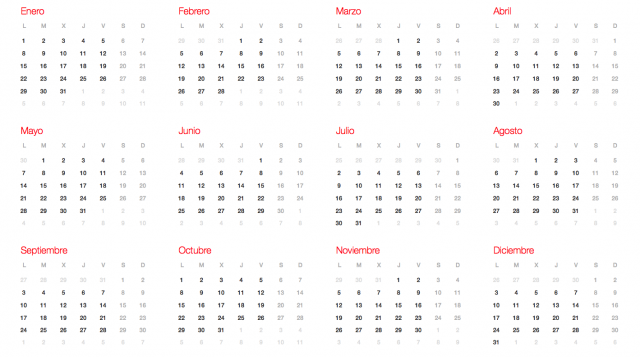 Los días festivos serán el 1 y el 6 de enero, que corresponden a las festividades de Año Nuevo y Epifanía del Señor. Caen en lunes y sábado, por lo que se podrán unir al fin de semana. También los días 29 y 30 de marzo, Jueves y Viernes Santos, permiten hacer otro fin de semana largo. Los días 1 y el 2 de mayo, Día del Trabajo y fiesta de la Comunidad de Madrid, caen en martes y miércoles, por lo que si los madrileños cogen el lunes como día libre, tendrían cinco días de vacaciones. El 15 de agosto, día de la Asunción de la Virgen,12 de octubre, el 1 de noviembre y los días 6, 8 y 25 de diciembre, son los últimos festivos para los madrileños. Respecto a este último grupo, el día 6 de diciembre es jueves y con el día 8 de diciembre es posible hacer otro período de descanso más extenso.