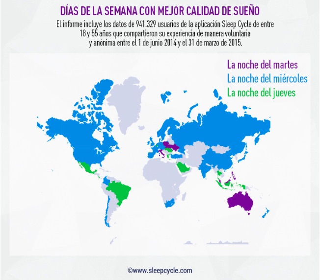Este programa, el Sleep Cycle, despierta a los usuarios en la fase más ligera del sueño, dónde menos les va a afectar. El estudio va acompañado de una divertida infografía en la que podemos apreciar cómo son las horas de sueño en todo el mundo. En España, la noche en la que tenemos un sueño de más calidad es la del miércoles, igual que en la mayoría de los países de Europa.