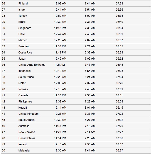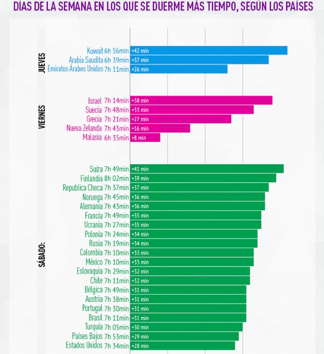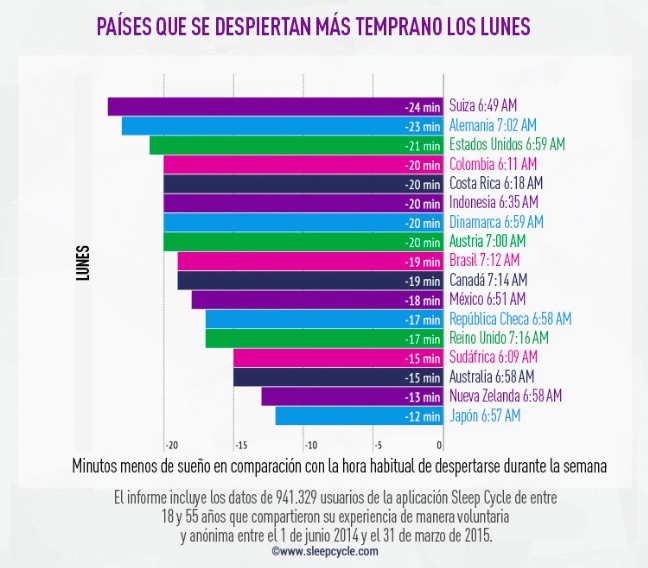 También tenemos los países que más temprano se levantan, y lo que madrugan las personas los lunes, el día más difícil de la semana para despertarse. Los finlandeses son los que más horas de sueño a la semana tienen. Los estadounidenses, suelen levantarse a las 8:24 AM los viernes, y se levantan más felices en Suecia o Nueva Zelanda. Aún así, un 71% de la gente se despierta mejor los domingos. Sobre todo en México.