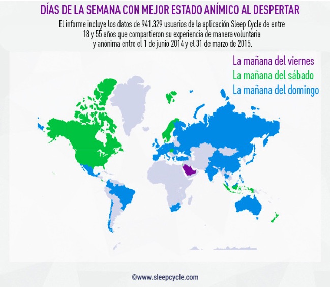 Como no podía ser de otra manera, la mayor parte de los países encuestados que se han prestado al estudio, un total de 941.000 usuarios de todo el mundo, se levantan con mejor estado de ánimo los domingos.