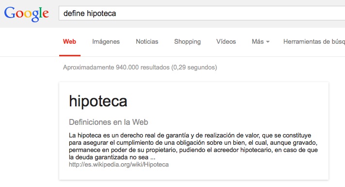 Si quieres usar Google como diccionario sólo tienes que teclear el comando define antes de la palabra cuyo significado deseamos conocer.