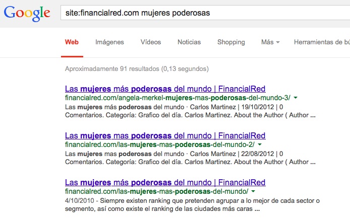 Por ejemplo, si estamos tratando de encontrar una noticia publicada en Financialred y no sabemos la fecha de publicación, pero sí que está relacionada con «mujeres poderosas», debemos teclear site:financialred.com mujeres poderosas. Todos los resultados que nos mostrará el buscador corresponderán a contenidos publicados únicamente en financialred.com