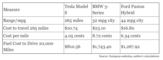 Para alguien que conduce 20,000 millas al año (32.000 km), el Tesla Model S podría ahorrar 934 dólares (850 euros) en combustible al año en comparación con el BMW Serie 3. Incluso contra un Ford Fusion Hybrid, el Modelo S ahorraría 457.36 dólares al año.