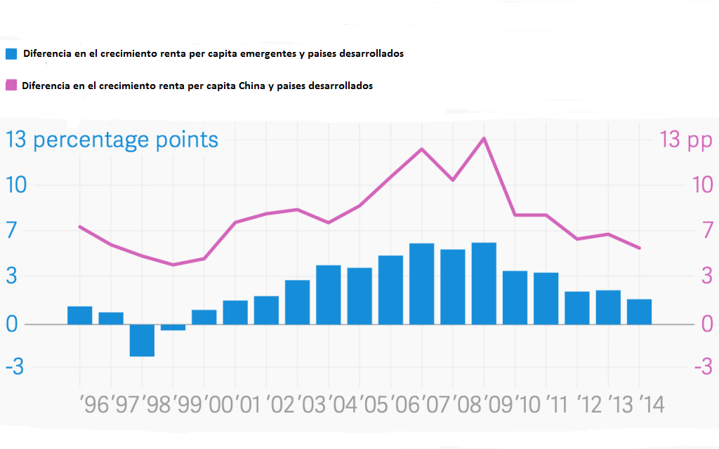 Y llegamos a uno de los meollos de la cuestión, la enorme desigualdad global. La caída de la recuperación del crecimiento se traduce directamente en problemas para aquellos que piensan que la tendencia va a continuar; si la tasa de crecimiento puesta al día se queda en 4.5 puntos porcentuales entre los emergentes y los países desarrollados, algo que ya ocurrió entre 2006 y 2009, los emergentes necesitarán unos 30 años para ponerse al día en relación a los ingresos por ejemplo de Estados Unidos, sin embargo con los niveles del pasado año 2013 está diferencia saltaría hasta los 50 años… aun así mucho más rápido de lo previsto durante la década pasada.