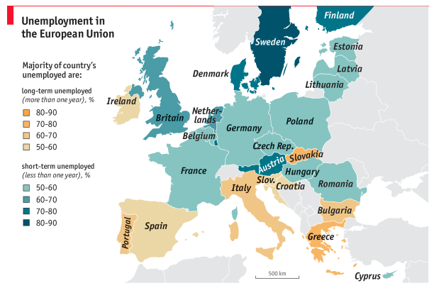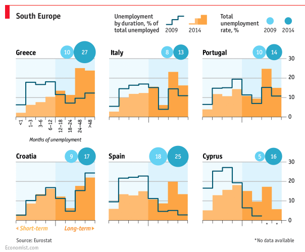 Como era de esperar, el problema es más grave en el sur de Europa. Más del 60% de los italianos por desempleo no han trabajado en más de un año; en Grecia la tasa es superior al 70%. La alta tasa de desempleo a largo plazo se debe en parte al hecho de que Italia tiene estas tasas provocadas por una severa recesión y un mercado laboral totalmente inflexibles. Además, los desempleados son más propensos a desconfiar de sus políticos y de la Unión Europea. Con esto han crecido los populismos.