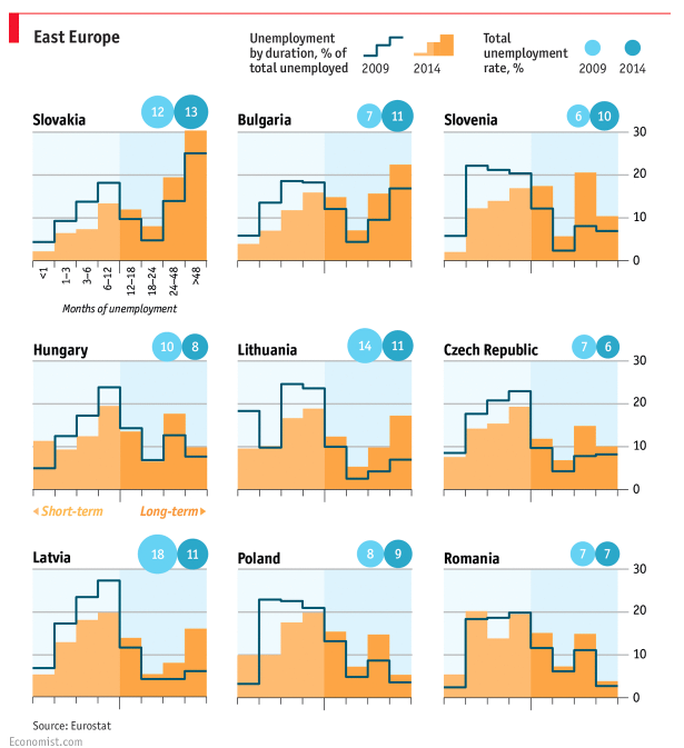 El problema también es grave en los nuevos estados miembros de Europa del Este. Pero estos países ya tenían estas tasas de desempleo de antes, después de las recesiones en 1990 y principios de 2000. En algunos lugares el desempleo a largo plazo se mantuvo a pesar de haber recuperación económica. Eslovaquia tuvo una fuerte caída en 1999; 2000-2007 tuvo crecimiento, in embargo, el desempleo de larga duración creció para compensar casi el 75% del desempleo total, ya que los trabajadores no fueron contratados en los buenos tiempos.