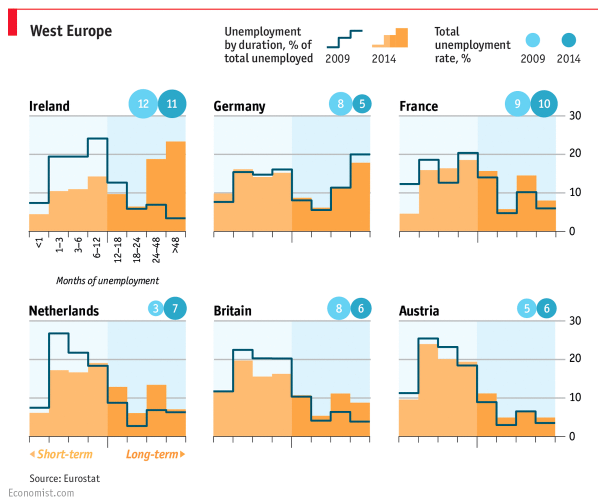 En las partes más ricas de Europa, el desempleo es una preocupación secundaria. Alemania, es el único país que ha reducido su tasa de paro de forma importante, debido en parte a su mercado laboral más flexible y las prestaciones de desempleo. Por el contrario, Irlanda, ha mejorado el empleo ha largo plazo, aunque la tasa general de desempleo ha caído, alrededor de 100.000 personas han estado sin trabajo durante más de dos años.