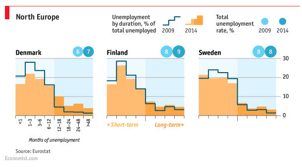 Por último, son tres los estados nórdicos de la UE con las tasas de desempleo más bajas a largo plazo, que van del 19% al 25% del desempleo total. Tales niveles bajos se deben en parte a las recesiones menos profundas, y en parte a las medidas de mercado de trabajo. Suecia con los planes de formación y créditos fiscales para la industria de la construcción. Pero con el desempleo a largo plazo en Europa, aún hay mucho que hacer.