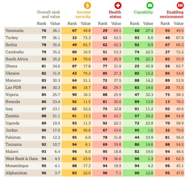 Las poblaciones de mayor edad de los tres países más bajos, representan menos del 5% de la población total. Países de América Latina han mejorado en este aspecto. Chile lidera un grupo de países de la región, ubicándose en el puesto número 22. Parte de este éxito se atribuye a la expansión de las pensiones sociales en toda América Latina. Sin duda una buena noticia, ya que Noruega presentó por primera vez su plan de pensiones basado en los derechos universales en 1937, mucho antes de que logró su estado de ingresos altos actual.
