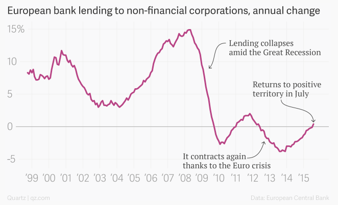 El gráfico muestra los préstamos de los grandes bancos europeos a las empresas no financieras. El capitalismo funciona en cuando a la deuda. El acceso al crédito corporativo se estancó por un sistema bancario disfuncional, el que Europa ha tenido durante los últimos años, algo con lo que la economía no va a crecer. Los préstamos bancarios son, aún más importantes en Europa que en los EE.UU., ya que las empresas, tradicionalmente, han tenido más acceso a otras formas de obtención de capital, tales como la venta de deuda en los mercados de bonos.