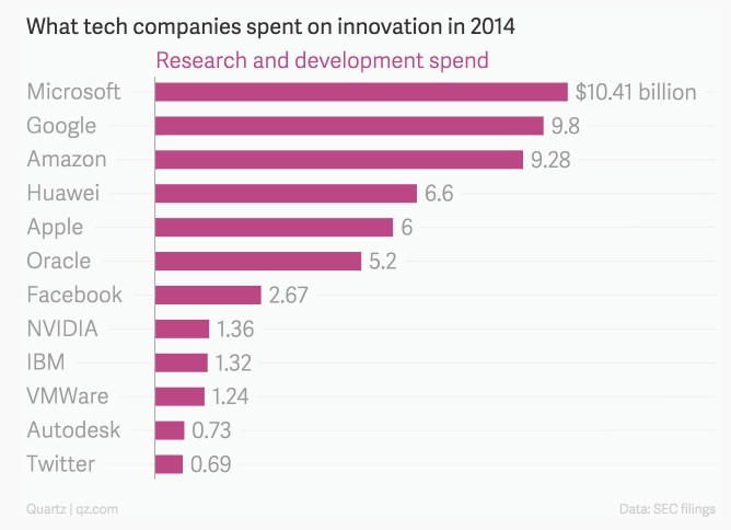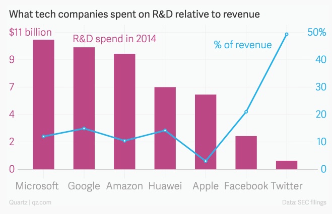 Pero esto no es así, si comparamos el gasto en I+D en relación a los ingresos. Huawei está gastando en I+D un 14,2% de los ingresos, frente a Microsoft con un 12% y Amazon con un 10,4% de sus ingresos. Sin embargo, las empresas de tecnología con ingresos «bajos» como Facebook, que ingresó unos 12,47 billones dólares el año pasado, y Twitter con 1,4 billones de dólares, están invirtiendo más en la innovación, como podemos ver en el gráfico siguiente. Sin embargo, un dato curioso es que Apple, una de las grandes compañías tecnológicas a nivel mundial, invirtió sólo el 3% en 2014.