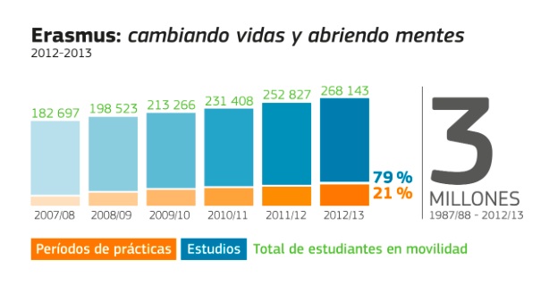 En el año 2013, disfrutaron del programa Erasmus más de 270.000 estudiantes. Sin duda la cifra más alta desde que se iniciara hace 27 años. Esta beca se otorga para estudiar o para realizar prácticas, pudiéndose disfrutar una sola vez, y previa realización de un examen de idioma. Posteriormente se publicará una lista con los admitidos, y su universidad. Los alumnos deberán poner más de un destino, ya que dependerá del nivel de idioma. Esta beca está dirigida para el personal docente y administrativo, académicos ( un máximo de 6 semanas) y por supuesto alumnos.