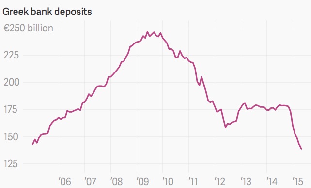 El martes 30 de junio, es decir, mañana, cuando expire el acuerdo de rescate de Grecia, el país le deberá al FMI 1.600 millones de euros. Este es el primero de muchos proyectos de ley a los que se enfrenta en las próximas semanas, aunque algo casi seguro es que no podrá pagar sin desbloquear la ayuda financiera adicional. El el siguiente gráfico vemos la evolución de los depósitos griegos desde el año 2006.