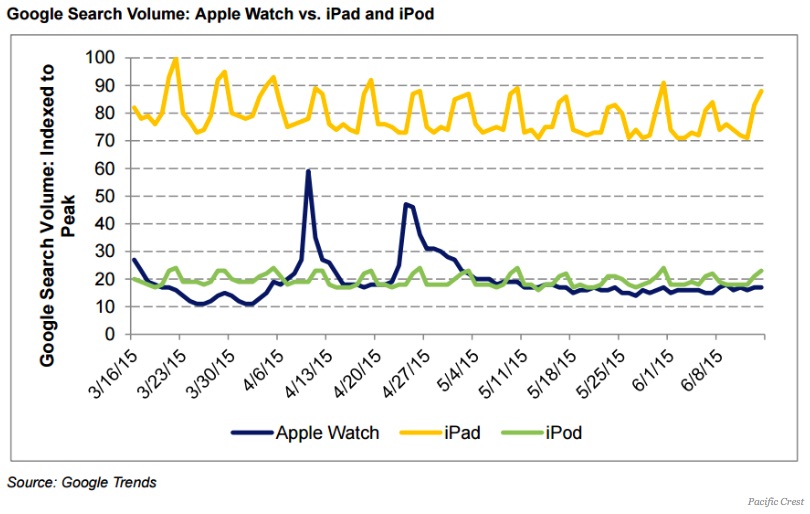 Un análisis de Pacific Crest Andy Hargreaves así lo afirma. Demuestra, que el interés en el reloj de Apple, medido por Google Trends, está por muy por debajo del interés que tiene los usuarios en el iPod. Efectivamente, el iPod un aparato que a priori parece estar muerto y sin apenas ventas, ya que el iPhone aporta las características de este aparato.