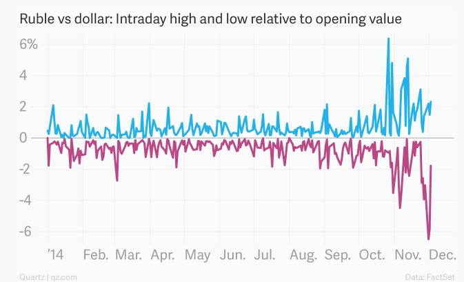 Esto es así por la situación del país. Podríamos asemejarlo con una electrocardiograma, en el cuál la persona está muy nerviosa por alguna situación actual o futura, y es lo mismo que le pasa al rublo ruso. La economía del país se está deteriorando, en parte por las sanciones que ha impuesto Occidente. El precio del petróleo ha caído, ya un 40%. El banco dijo que iba a intervenir la moneda, sólo cuando sus movimientos amenazaron la estabilidad financiera.