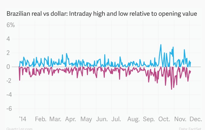 Sin duda la situación de Rusia no es la única, ya que el petróleo influye en muchos países. Por ejemplo, el real brasileño, moneda de un país BRIC, productor de petróleo, tienen una evolución bastante normal, hasta que este cayera durante los últimos meses, como se aprecia en el gráfico. Pero como decíamos antes en términos de volatilidad el rublo ruso se lleva el premio.