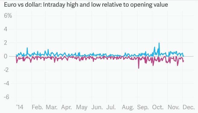 Estos son grandes movimientos en una moneda. Y supone para cualquier empresa, o inversor, o aquel que intercambie bienes y/o dinero, un gran problema. La volatilidad también ha impulsado los rumores de una futura imposición de controles de capital para calmar las cosas, aunque de momento lo ha negado. Si comparamos el gráfico anterior con el del euro/dólar, en la misma escala, la evolución ha sido algo más estable y ordenada en comparación con el rublo.
