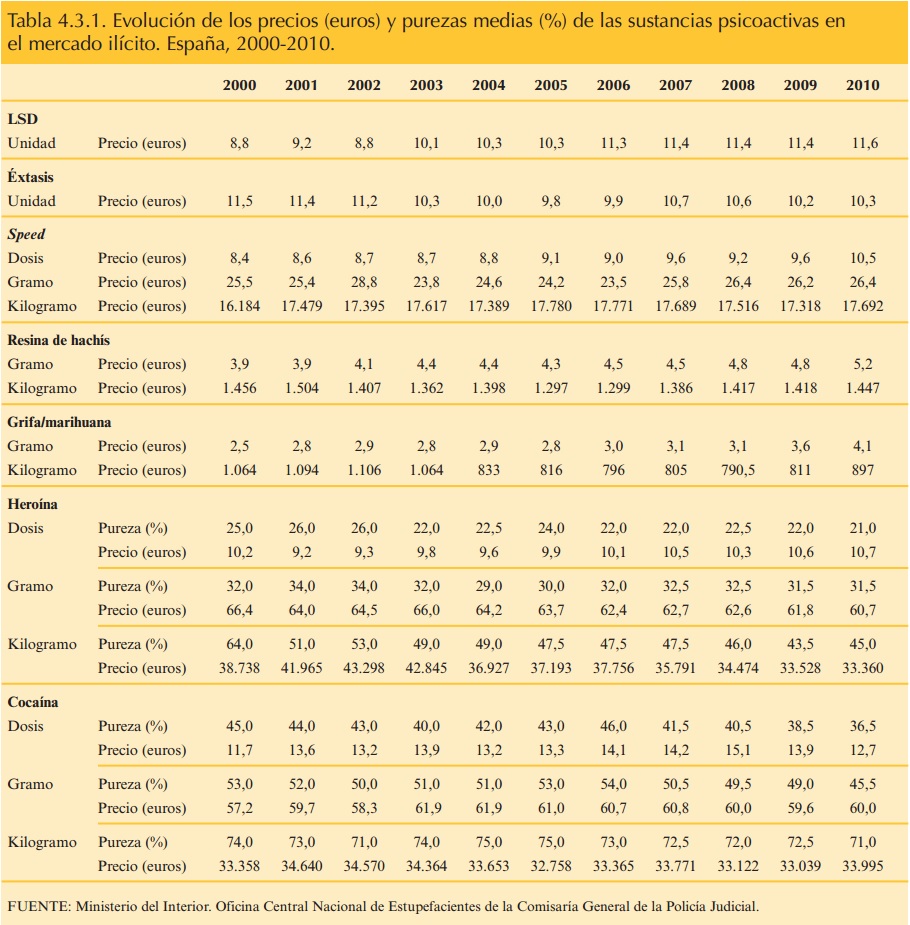 Si aplicáramos la evolución de los precios al caso de nuestro país, podemos ver efectivamente en el siguiente cuadro como éstos no se ha movido realmente mucho en el caso de la heroína aunque, lo ha hecho a la baja en cualquier caso.