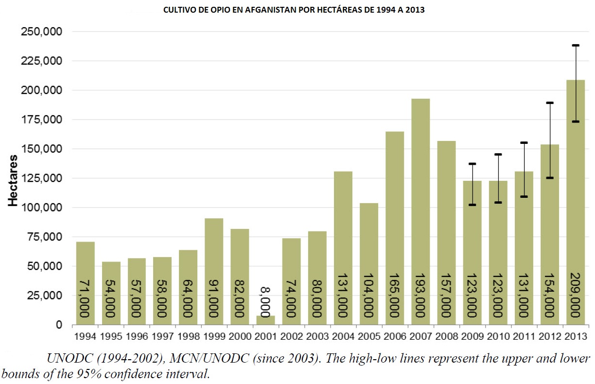 En lo que sin embargo sí parece que encontramos una relación directa más evidente, es en el espectacular crecimiento del cultivo del opio. Si comparamos los datos de crecimiento de este cultivo durante el periodo de ocupación estadounidense de Afganistán, podemos comprender cómo una parte importante de la opinión pública norteamericana tiende a pensar que existe una relación directa entre este periodo de ocupación y el aumento notable de la introducción de heroína en el país y su distribución internacional, los datos son relevantes desde luego: