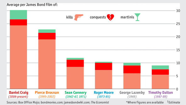 La dinámica de las películas no ha cambiado, lo único que ha hecho es mejorar y por supuesto aumentar. En el siguiente gráfico, podemos ver la evolución de las películas con los diferentes actores, y por supuesto, la recaudación que han tenido con cada uno de ellos. Sin duda, Daniel Craig, gana por goleada.
