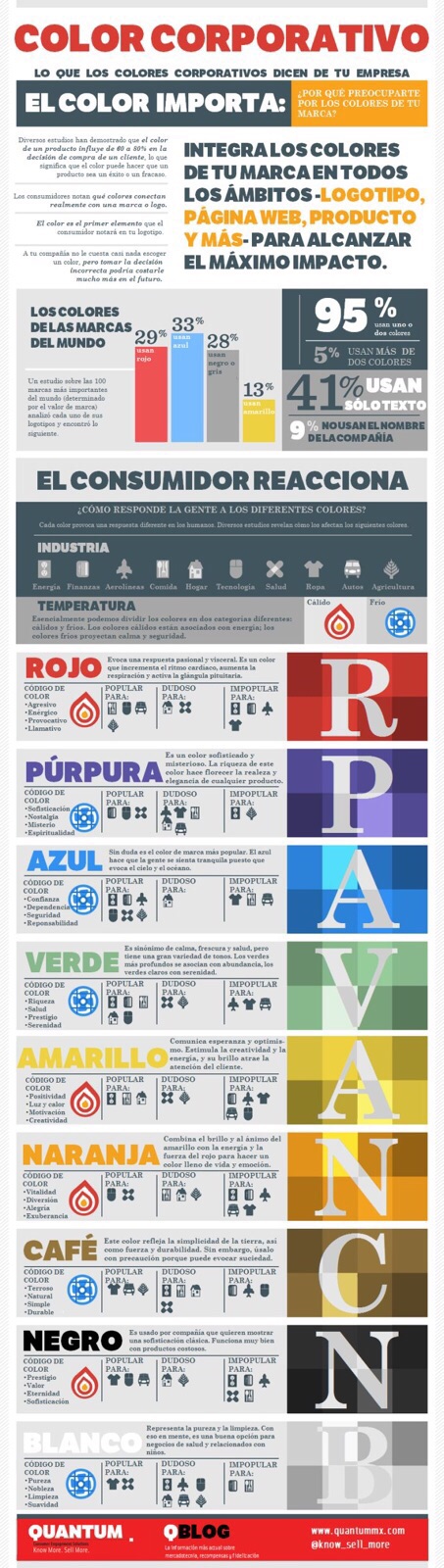 Además un 95% usan uno o dos colores. Un 5% usan más de 2 colores y un 41% usan solo texto. Solamente un 9% no usa el nombre de su compañía en la marca. Desde Quantum nos ofrecen una completa infografía, sobre los colores de las empresas, y sobre cuáles son los más adecuados para cada tipo de empresa.