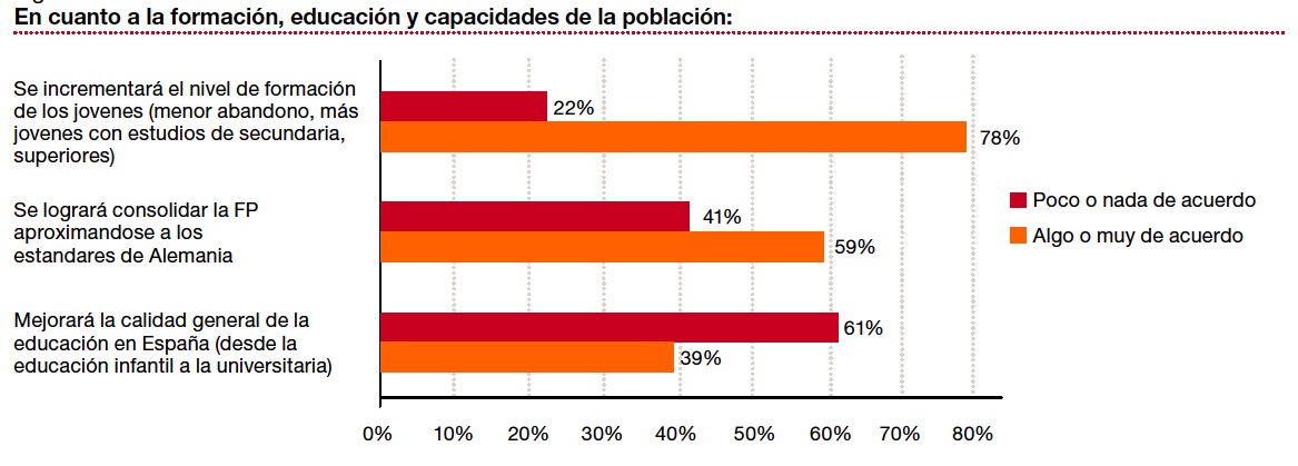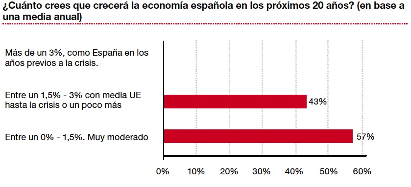 Un estudio realizado por PWC, nos enseña cuál es la opinión de los empresarios españoles sobre España, y sobre su evolución. En el estudio podemos diferenciar dos tipos de empresarios. Unos con «visión europea» que creen en un crecimiento de España en parte ayudado por la evolución europea, además de una alineación entre todos los países que la integran; y por otro lado, los que creen que esta recuperación será bastante moderada, concretamente un 57% de los encuestados.
