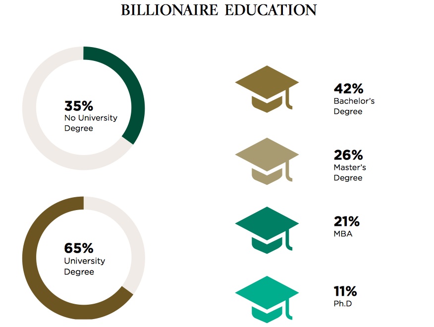 Gracias a un estudio «Wealth-X and UBS Billionaire Census for the year 2014» podemos conocer de primera mano, cuales son las universidades que más multimillonarios «producen». Según el estudio el 35% de los multimillonarios del mundo no tienen un título de licenciatura y algunos incluso no terminaron la etapa de secundaria. No obstante, del 65 % que sí tiene un título de licenciatura , una buena parte continúa sus estudios. El 21% de los multimillonarios con «educación» tiene un MBA y el 11% de las multimillonarias tienen un doctorado.