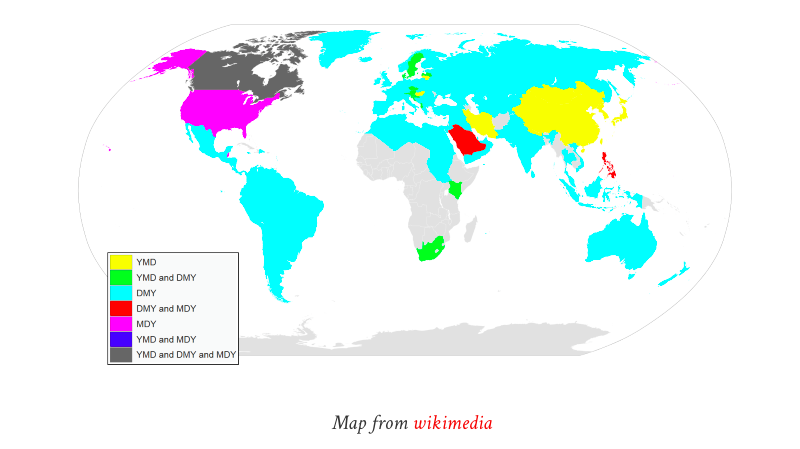 Sin embargo, como muestra el mapa arriba, ese formato no se utiliza comúnmente fuera de Asia Oriental. En lugar de este, tienen varias clases de formatos, y todas ellas se utilizan. El más común es el opuesto a la norma ISO 8601 y va así, Día-Mes-Año. Esto mantiene un cierto sentido lógico, que va desde la unidad más corta de tiempo a la más larga.