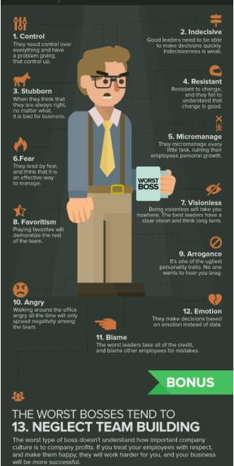 Uno de los factores más importantes para estar contentos con nuestro trabajo es «el jefe». Sin duda, su forma de ser puede influirnos tanto positiva como negativamente en la empresa, y se nota mucho la diferencia entre un buen jefe y uno malo. Tener un mal jefe, es fatal para el empleado, pudiendo llegar incluso a extremos como la baja o la depresión. No todo el mundo puede ocupar puestos en los que tenga que mandar o tenga influencia sobre otros. Además, esta actitud no llega solo a algunos empleados, ya que puede llegar a afectar a la empresa en conjunto.
