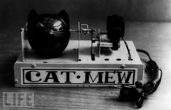 ¿Hartos de los ratones?, tranquilos, aquí está Cat Mew Machine. Esta máquina inventada en Japón en los años 60 del pasado siglo, funcionaba al conectarse a la red eléctrica emitiendo de manera repetitiva un sonido similar al maullido de un gato mientras que la pieza que simula la cabeza del felino podía moverse al compás y lanzaba unos destellos rojos cada 10 segundos por los ojos. Puede que fuera el terror de los ratones, pero, no pudo competir con las tradicionales ratoneras.