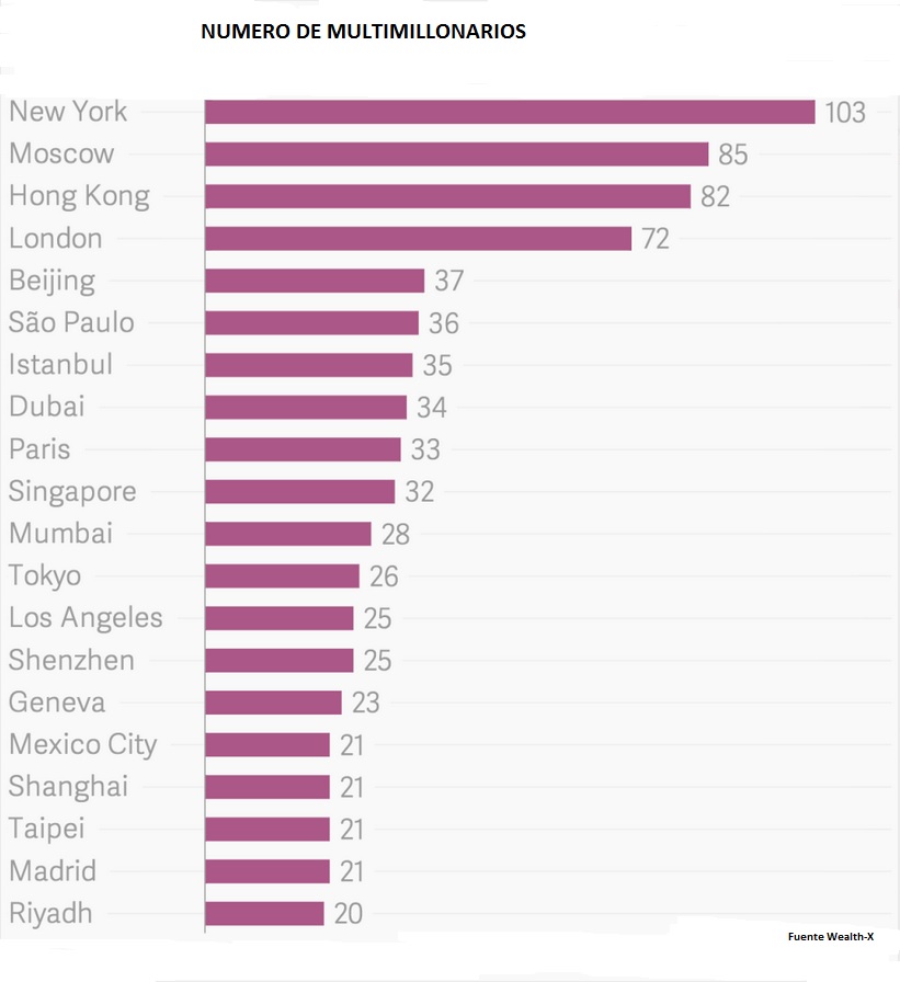 Si se trata de ciudades, y como era de esperar, los más ricos buscan vivir cerca de los centros financieros mundiales más importantes. De hecho el 35% de todos los multimillonarios viven repartidos entre las 20 ciudades más populares del mundo; el 15% se reparten entre cuatro ciudades Nueva York, Moscú, Hong Kong y Londres.