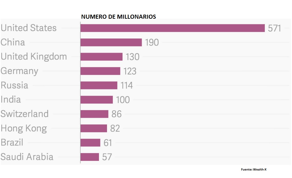 Desde el punto de vista de los países de residencia de los multimillonarios, también Estados Unidos lidera la clasificación ya que en este país residen tres veces más multimillonarios que en cualquiera de los que otros países. Hay que hacer notar el número de millonarios creciente en los países en desarrollo, concretamente en los BRIC.